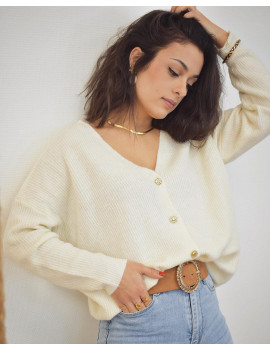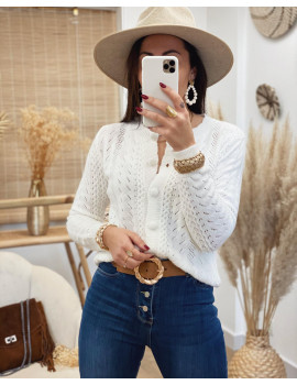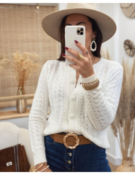 Gilet ajouré. Col rond. Boutons écru et dorés. Manches longues. Taille Unique. Murielle mesure 1,65 m et porte habituellement du S (36). Fabriqué en Chine. Entretien & Lavage : Suivre les indications sur l'étiquette produit.