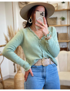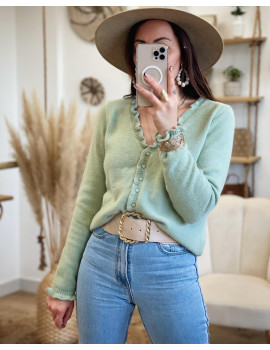 Gilet à volants. Col V. Boutons vert d'eau et doré. Manches longues bout à volants. Taille Unique. Murielle mesure 1,65 m et porte habituellement du S/36. Fabriqué en Chine. Entretien :