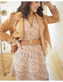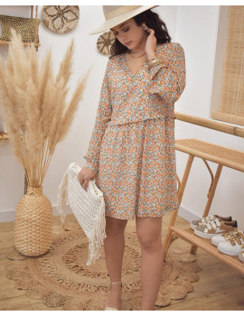 Robe péplum fleurie Coupe ample Col en V Détails dorés Manches boutonnées Volants sur la taille Doublée Camille porte généralement du 34. Elle mesure 1,60 m et porte la taille S Fabriquée en Chine Entretien :