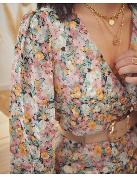 Robe longue fleurie Cache-cœur Dos et manches non doublés Élastique à la taille Manches resserrées Camille fait habituellement du 34 et mesure 1m60. Elle porte une taille S Fabriquée en Chine Entretien :