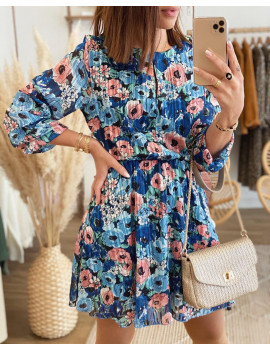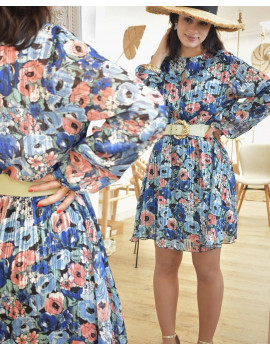 Robe bleue fleurie Manches longues Élastique à la taille Fentes au dessus de la poitrine Dos et manches non doublés Détails en lurex Camille porte généralement du 34. Elle mesure 1,60 m. Fabriquée en Italie Entretien :
