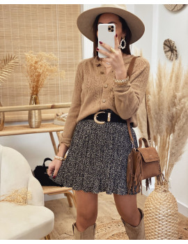 Jupe plissée mi-longue Motifs floraux beiges Détails en lurex Élastique à la taille Doublée Camille fait habituellement du 34 et fais 1m58. Elle porte une taille S Fabriquée en Chine Entretien :