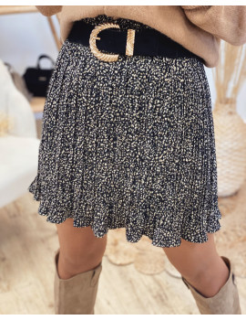 Jupe noire courte plissée Motifs animaliers Taille élastique Doublée Murielle mesure 1,65 m et porte habituellement du S (36). Fabriquée en Chine Entretien :