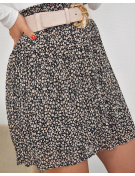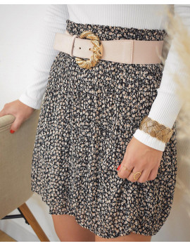 Jupe courte plissée. Motifs fleuris sur fond noir. Taille élastique. Doublée. Camille fait habituellement du 34 et mesure 1m60. Elle porte une taille S. Fabriquée en Chine. Entretien :