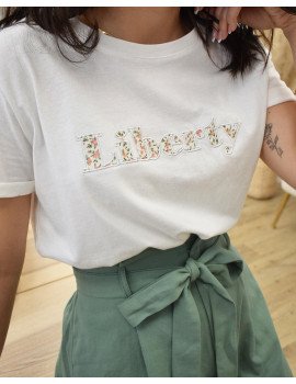 T-shirt blanc Col rond Coupe droite Manches retroussées "Liberty" fleurie brodé Camille fait habituellement du 34 et mesure 1m60. Elle porte une taille S. Fabriquée en Chine. Entretien :