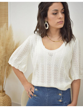 Pull fin ajouré Réversible Col rond Manches courtes amples Camille fait habituellement du 34 et mesure 1m60. Elle porte une taille S. Fabriquée en Chine. Entretien :