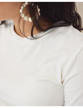 T-shirt blanc côtelé Col rond Tissus extensible Camille fait habituellement du 34 et mesure 1m60. Fabriqué en Italie. Entretien :