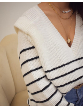Pull à épaulettes écru. Col V. Mailles tressées. Taille unique. Camille porte habituellement du 34 et mesure 1,58 m. Fabriquée en Chine. Entretien :
