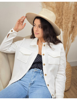 Veste blanche matelassée Boutons en écaille Poches sur la poitrine Manches boutonnées Camille fait habituellement du 34 et fais 1m58. Elle porte une taille S Fabriquée en Chine Entretien :