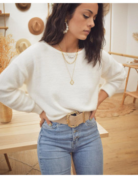 Pull blanc tout doux Col rond Dos travaillé avec de la transparence et de la dentelle Camille fait habituellement du 34 et fais 1m58. Fabriqué en Chine Entretien :