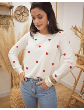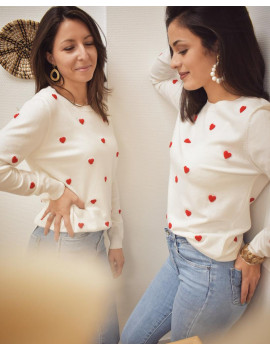 Pull blanc fin Cœurs rouges en éponge Col rond Maille douce Camille et Ketleen portent habituellement une taille 34 et mesurent respectivement 1m60 et 1m62. Elles ont choisi la taille S/M. Fabriqué en Chine Entretien :