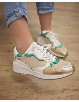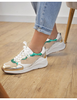Baskets en mesh beige décorées d'empiècements tricolores. Bande arrière effet poulain imprimé guépard, détails en similicuir blanc et détails vert métallisé. Fermeture à lacets blancs, bout en amande et garants or texturé et semelle blanche ultra légère. Hauteur du talon : 4,5 cm Hauteur de la plateforme : 2 cm Hauteur de la tige : 5,5 cm Si vous êtes entre 2 pointures, prenez celle du...
