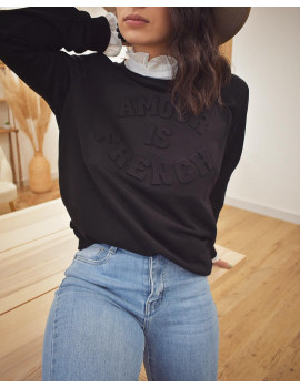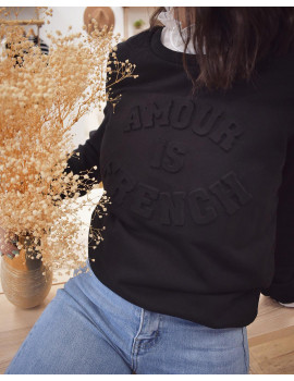 Sweat noir Impression 3D du mot "Amour is French" Col rond Camille porte habituellement du S-S/M et fais 1m58, a choisi une taille M/L pour un effet loose. Fabriqué en Chine Entretien :