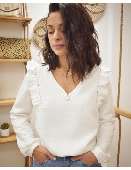 Sweat blanc matelassé Col en V Détails volants et dentelle sur les épaules Boutons dans le dos Camille fait habituellement du 34 et fais 1m58. Elle porte une taille S Fabriqué en Chine Entretien :