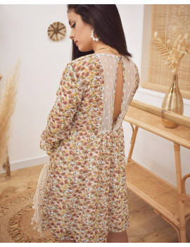 Robe péplum fleurie Coupe qui se porte ample Col en V Dentelle sur le col Manches 3/4 resserrées Dos ouvert en dentelle Dos et manches non doublés Camille porte généralement du 34. Elle mesure 1,60 m et porte la taille S Fabriquée en Chine Entretien :