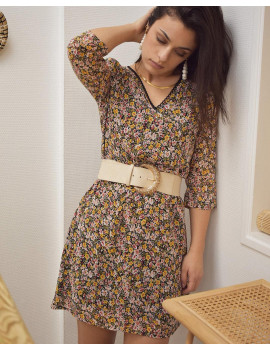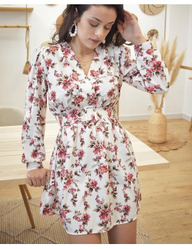 Robe cache-coeur fleurie Élastique à la taille Ceinture en tissus fournie Manches bouffantes Boutons pressions pour fermer le décolleté Volants sur le bas de la robe Dos non doublé Camille porte généralement du 34. Elle mesure 1,60 m et porte la taille S Fabriquée en Chine Entretien :