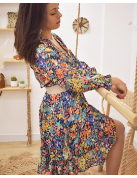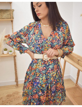 Robe portefeuille fleurie colorée Détails en lurex Doublée sauf manches Manches 3/4 Volants sur le bas de la robe Camille porte généralement du 34. Elle mesure 1,60 m et porte la taille S Fabriquée en P.R.C. Entretien :