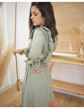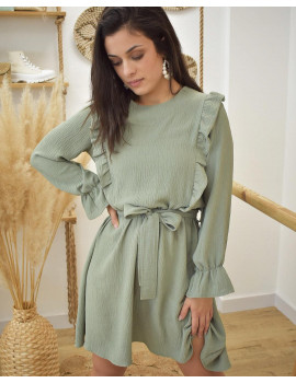 Robe vert sauge Volants sur la poitrine Resserrée à la taille Ceinture en tissus fournie Manches 3/4 resserrées Camille fait habituellement du 34 et mesure 1m60. Elle porte une taille S/M Fabriquée en France. Entretien :