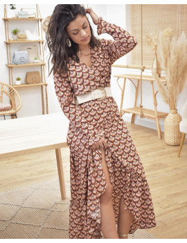 Robe longue portefeuille Manches longues Volants sur les manches et le bas de la robe Ceinture à nouer à la taille Détails dorés Camille fait habituellement du 34 et mesure 1m60. Elle porte une taille S. Fabriquée en Chine. Entretien :
