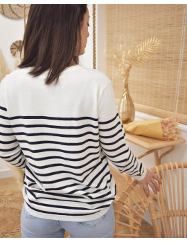 Pull marinière Bande rouge brodé avec l'inscription "Smile" Mailles douces et extensibles Camille porte généralement du 34. Elle mesure 1,60 m. Fabriqué en Chine Entretien :